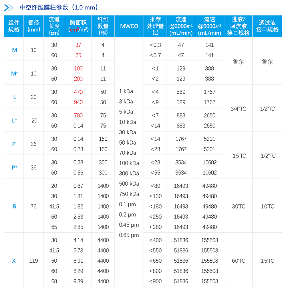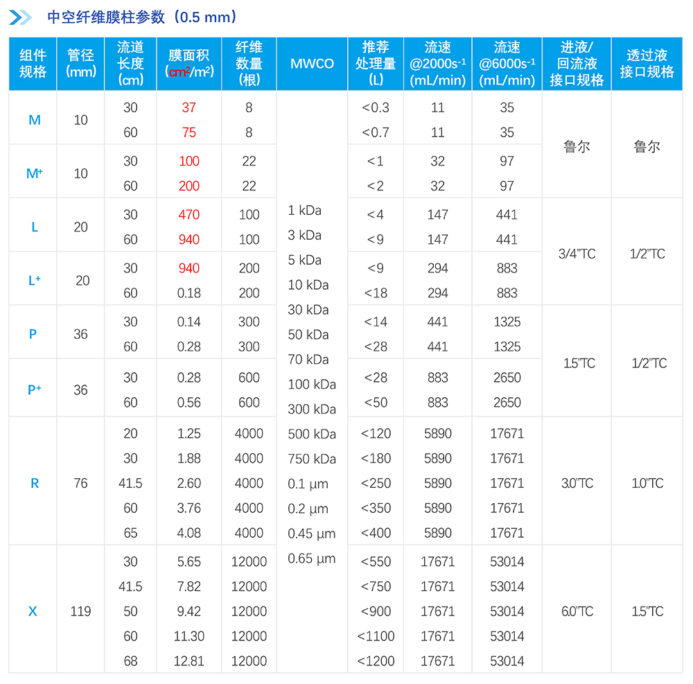 中空纖維膜絲采用改性聚醚砜(mPES)制備,抗污染性能強;非對稱梯度孔結構及均一孔徑保證高過濾精度的同時能獲取更高通量,提高產(chǎn)品收率。中空纖維膜柱采用符合醫(yī)療級別的外殼材料,生物相容性優(yōu)異,在滅菌環(huán)境中穩(wěn)定性優(yōu)良;選用的膠黏劑粘接強度高,耐熱性、耐化學性及生物相容性優(yōu)良;同時采用優(yōu)化的注膠工藝,注膠精度高,產(chǎn)品無缺陷。