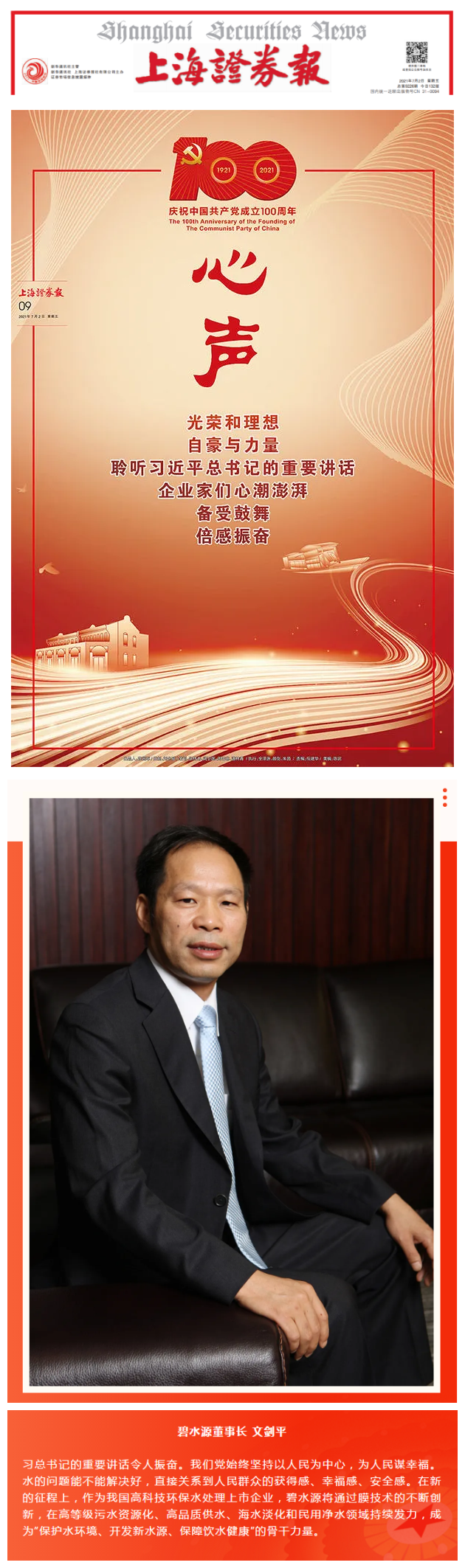 《上海證券報》:碧水源董事長文劍平的心聲(慶祝建黨100周年特刊)